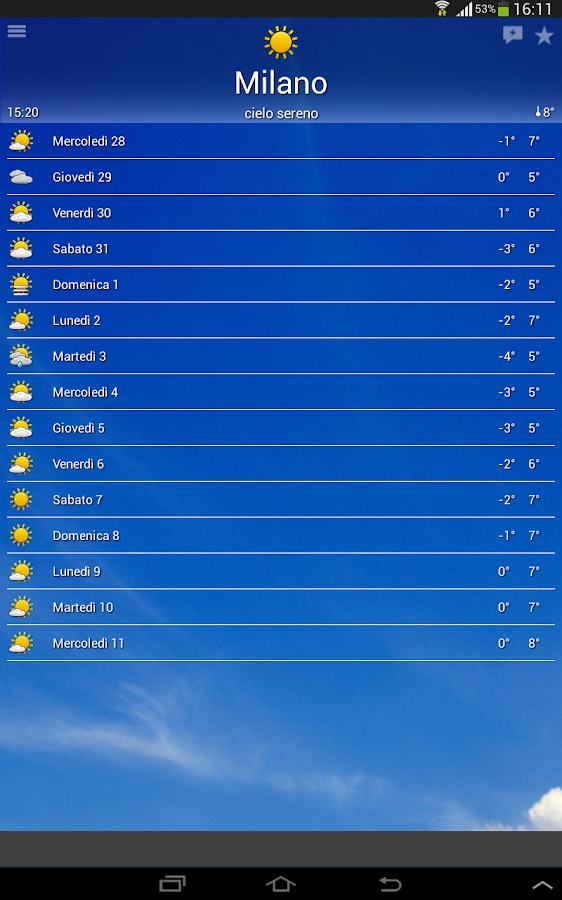 Weather Mate, un'app per il meteo in stile MIUI | AndroidWorld from www.androidworld.it Il radar interattivo con animazione consente inoltre di monitorare. * attenzione il cerchietto che trovate sulla sinistra sulla nostra app, indica l'attendibilità della previsione per quel giorno espressa in. Puoi consultare le previsioni meteo per l'italia e tutto il mondo, in particolare: Europa per le applicazioni meteo mobile. Store préféré dès aujourd'hui ! Ef þú fara að setja il meteo á tækinu, android tækið þarf til að hafa 2,3 android os útgáfa eða hærri. A műholdas képek italia, akkor láthatjuk, ha az ilyen ragyogó és hol felhős az ég.il mondo, europa africa giappone fonte. Un'app tutta italiana yahoo meteo: